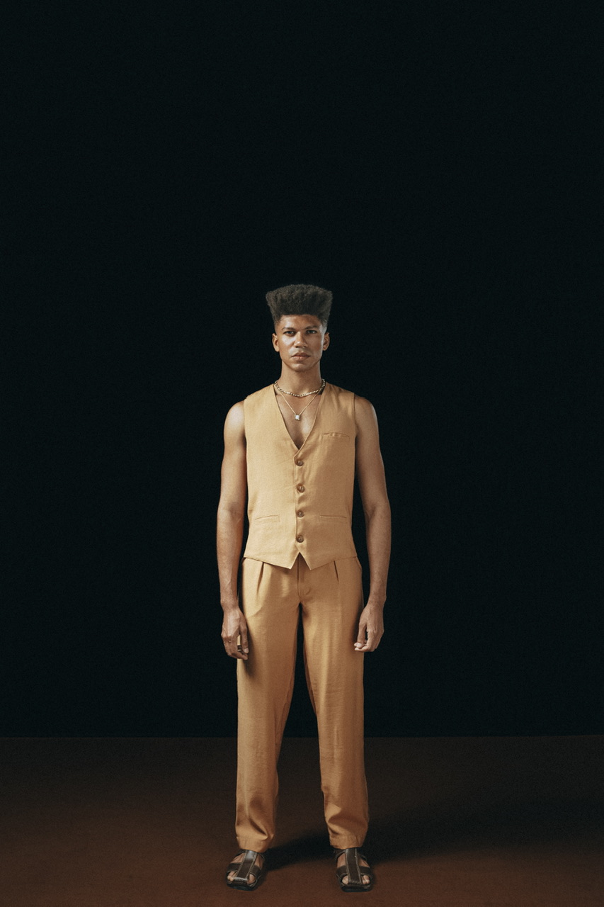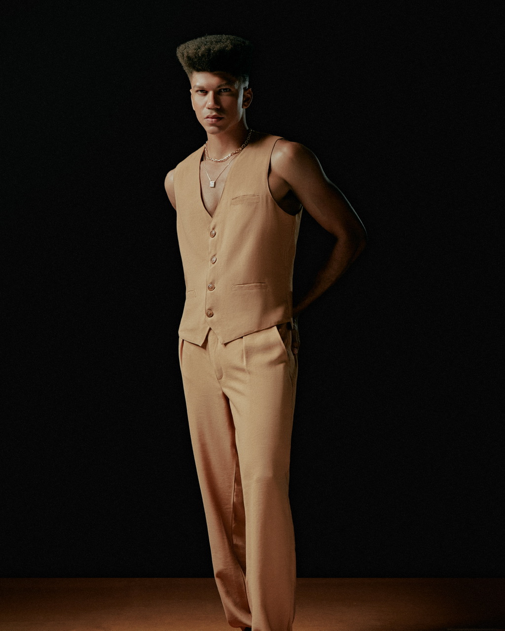 Colete + calça reta alfaiataria em viscose Cupro na cor NUDE.