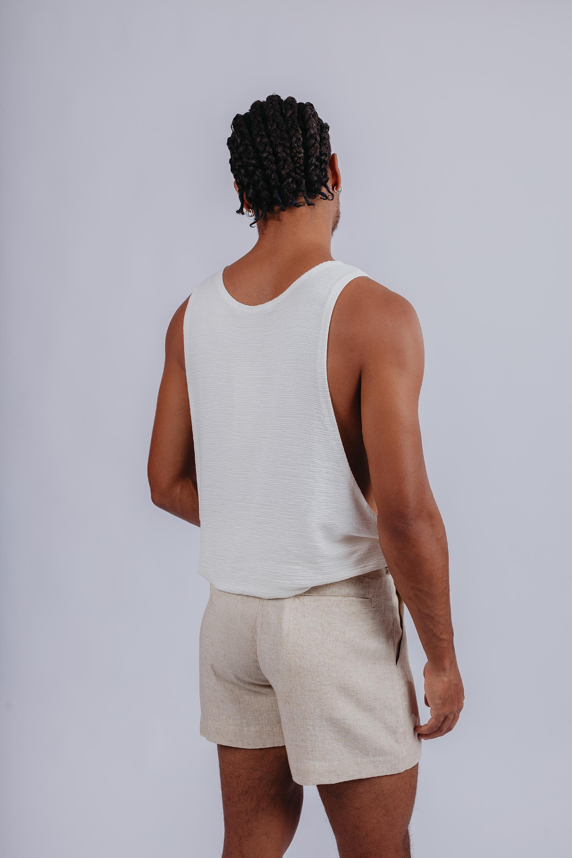 Bermuda em linho misto cru, bolsos faca laterais, bolso embutido na parte traseira, abotoamento em metal embutido, comprimento de 38cm.