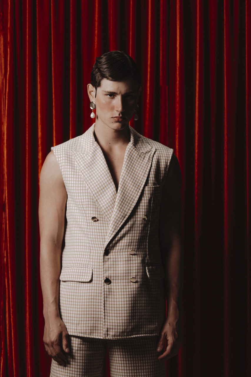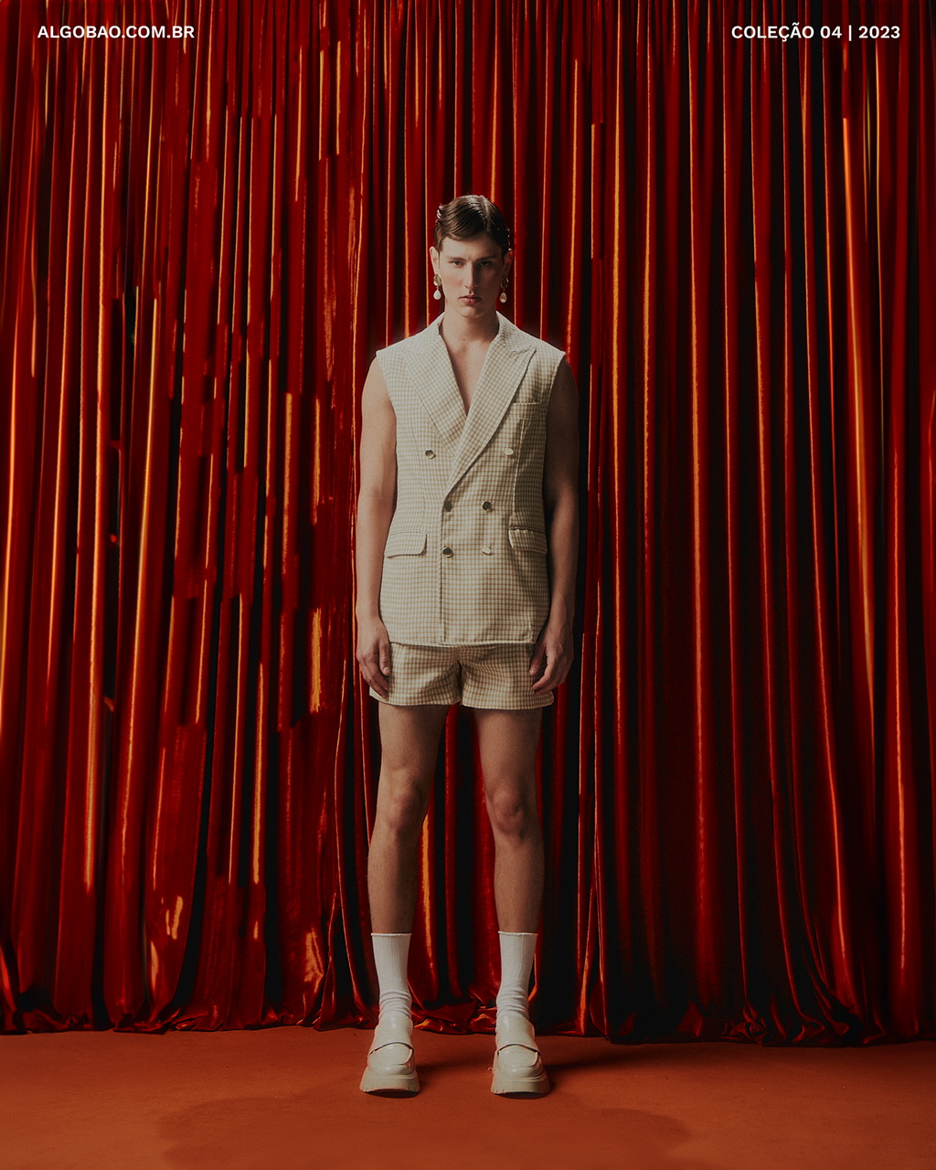 Confeccionado em tecido tweed, um tecido com lã de fio grosso na composição, como base do material. A trama dele é simples, o tecido é encorpado, grosso e as peças produzidas com ele ficam bastantes elegantes.
