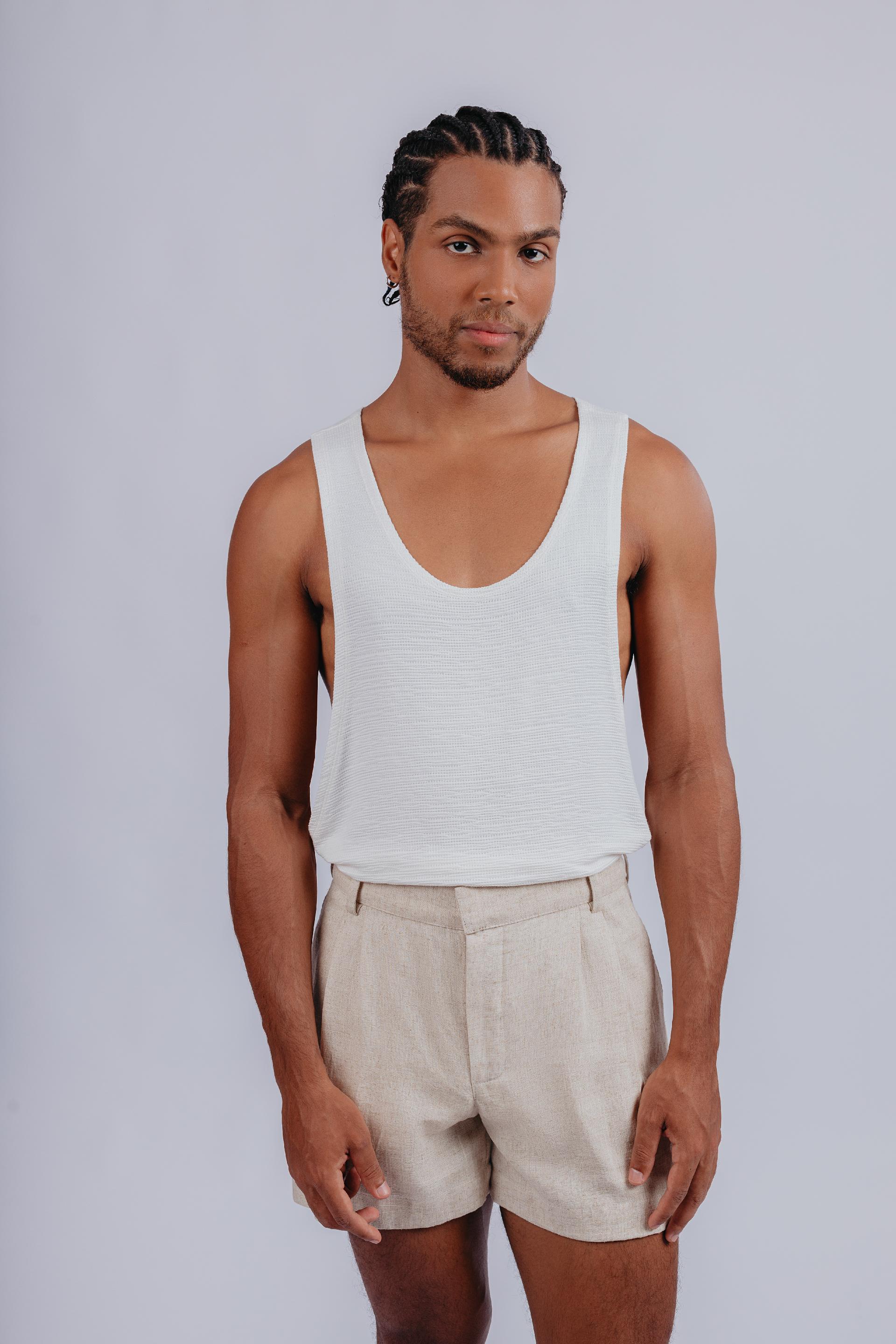Bermuda em linho misto cru, bolsos faca laterais, bolso embutido na parte traseira, abotoamento em metal embutido, comprimento de 38cm.